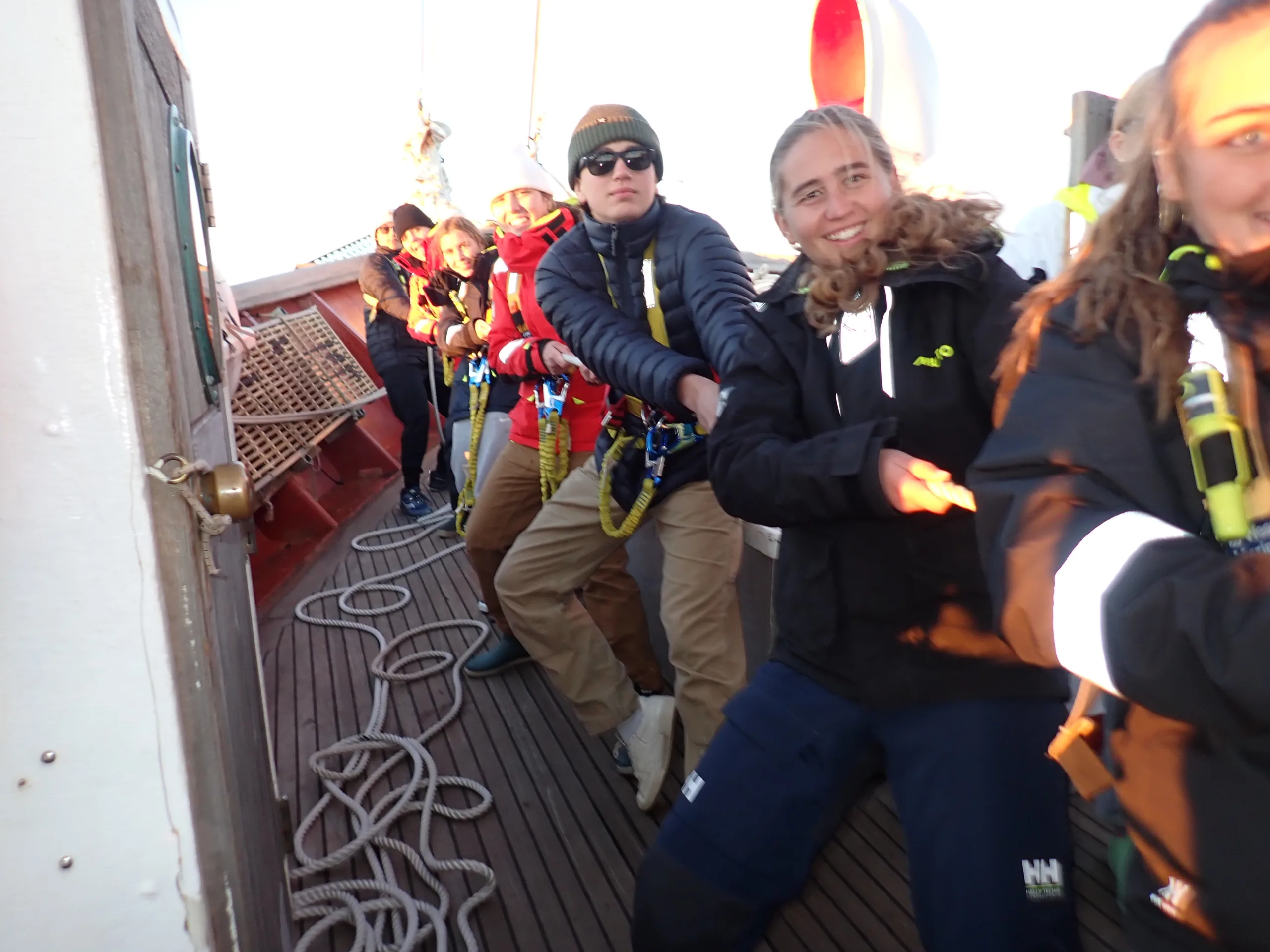 Getting underway from the dock is a process that takes planning, coordination, and a willingness to be at the ready to safely pitch in during the intricate dance with wind, currents, and ship traffic. With the professional crew handling the ship’s dock lines and other key navigational duties, student crew could watch and participate at key, predetermined moments in the process. So it was that we all worked as a unified crew and bid farewell to land and the group of SEA folks gathered on the wharf to wish us well and help cast off lines.