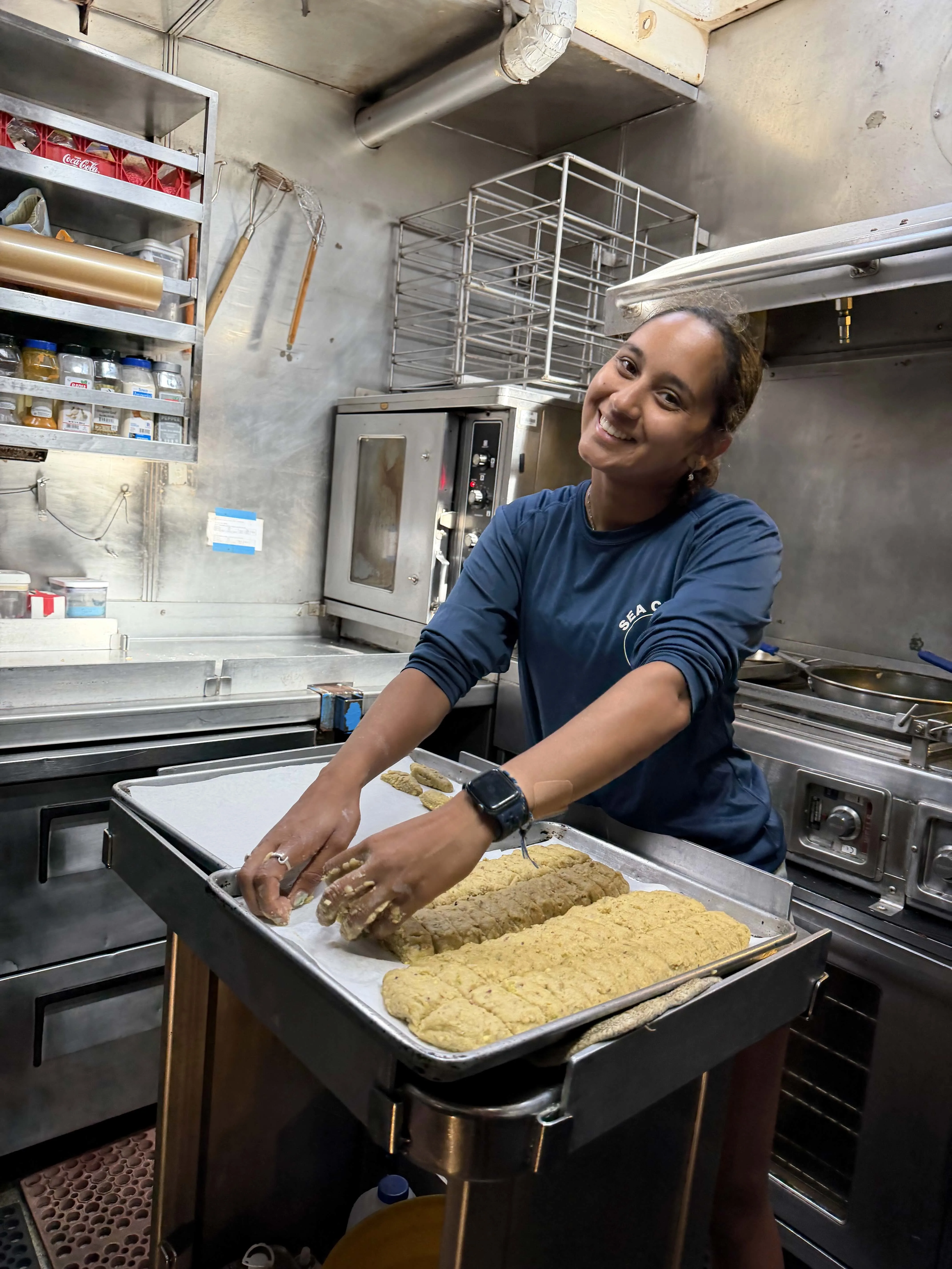 Today’s snack for the afternoon will be the regular candy treats along with some green apple slices. An apple a day keeps the dentist away, you know what they say! We also made some midrats this morning, the fun treats left out for those on evening and dawn watches. Our idea for today’s stemmed from a dawn watch tradition of “teatime,” when the deck and lab teams on watch come together on the quarter deck and take a small break to star gaze, ask a fun question, etc. I wanted to make a treat that had some sweetness but wasn’t overbearingly sweet, that would complement a nice cup of tea. One of our amazing stewards Sally mentioned biscottis and it was a done deal! Together Sally and I whipped up batches of pistachio vanilla biscottis, some gluten free for or gluten free friends.