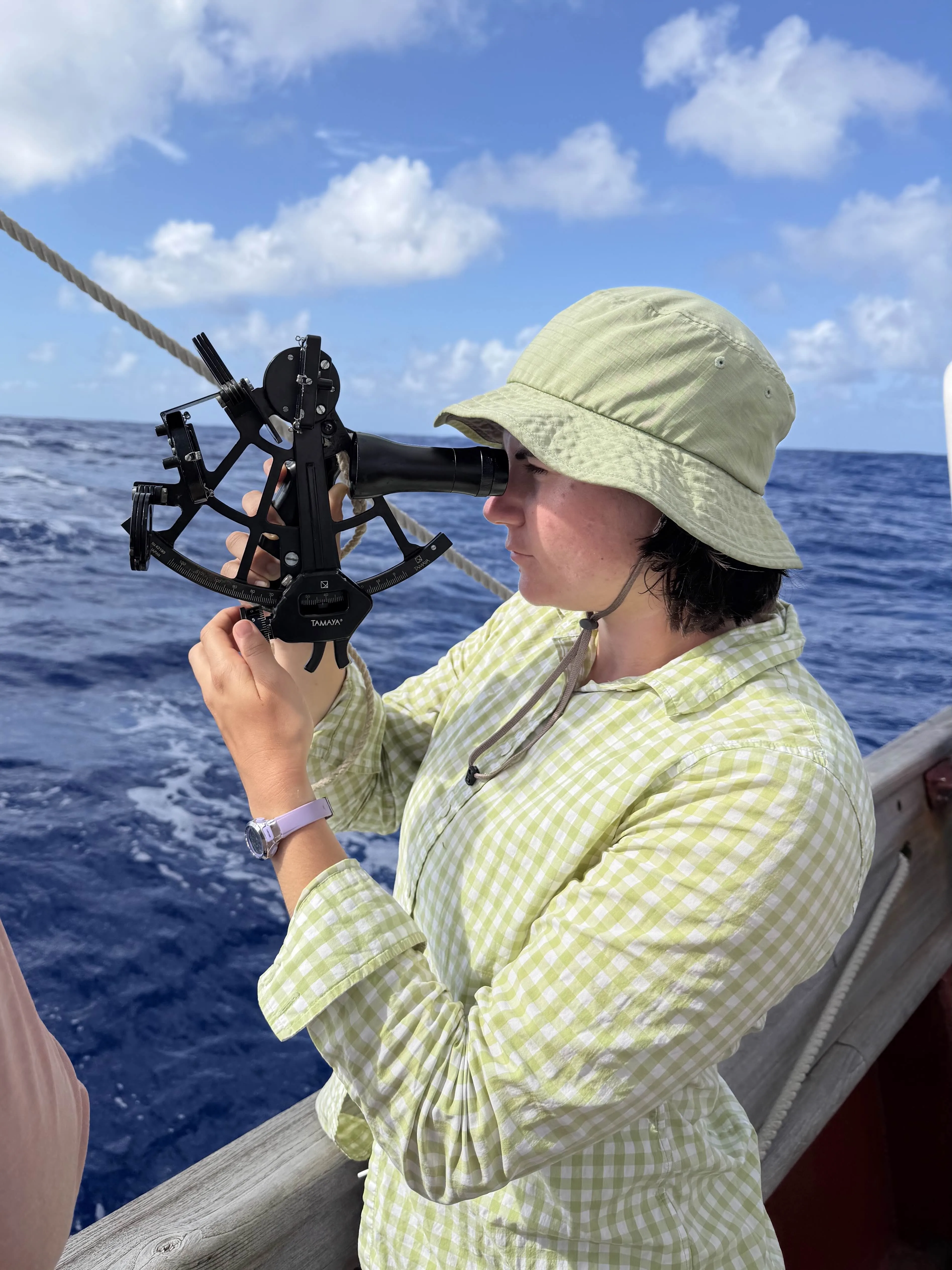 After that, it was time for bed! If you lay just right, you don’t even have to get up to eat, because the ocean will turn your stomach into a soup! After bedtime, I got up for my afternoon watch. Afternoon watch is sort of like cheating, because you get to see with your eyes, normal style. We had class today at 14:30, during which we covered sextant use (Pictured here by the lovely Kate), and the surrounding math of sextants. To boil it down, if you point the sextant deep into the iris of the ocean, you can calculate the angle that the blue comes back to you from. But, because different parts of the ocean have different color, you can compare you color with an almanac published every year that covers different ocean colors. The colors are proprietary, however, and pantone charges an arm and a leg to use them. We have knockoff colors on the deck, but we are always a little bit off, which makes navigation a pain, especially since I accidentally dropped a bit of toothpaste back behind the GPS on Tuesday, and we have been using celes-teal navigation ever since.