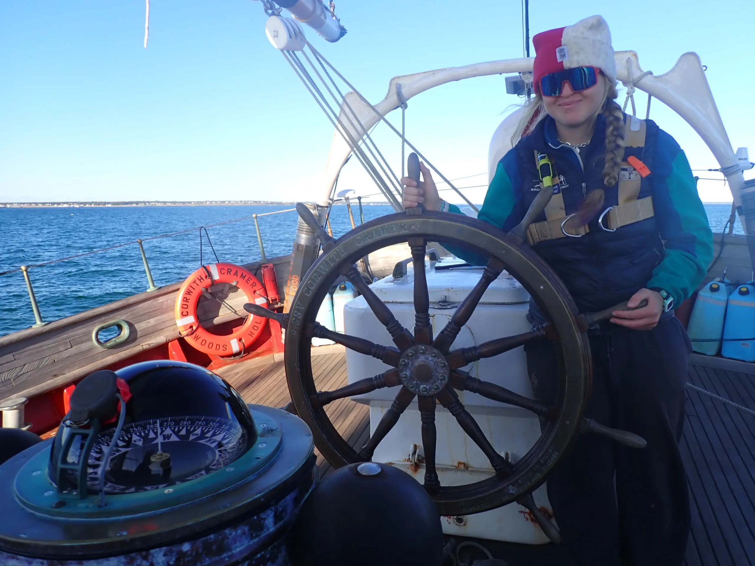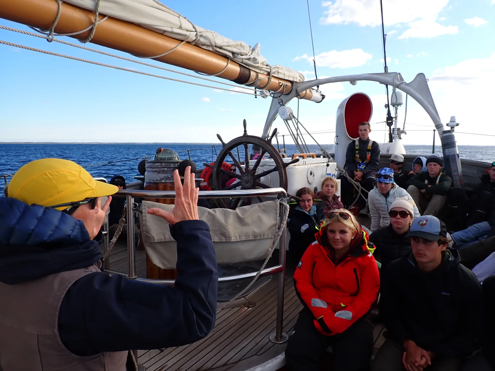 Greetings, once again, from the Corwith Cramer! Today was a day filled with more exciting firsts for the students as we got underway from Vineyard Haven and sailed (and motor sailed) to Nantucket. Sails were set and struck underway, yards were braced appropriately, tricks (turns) at the helm were taken by most, and we had our first afternoon ship’s meeting to learn about the specifics of the academic work to be done underway. It was a fun, but very busy day. And now, as it wraps up, the ship is filled with the sounds of laughter, a strumming guitar, and a chorus of singing voices.