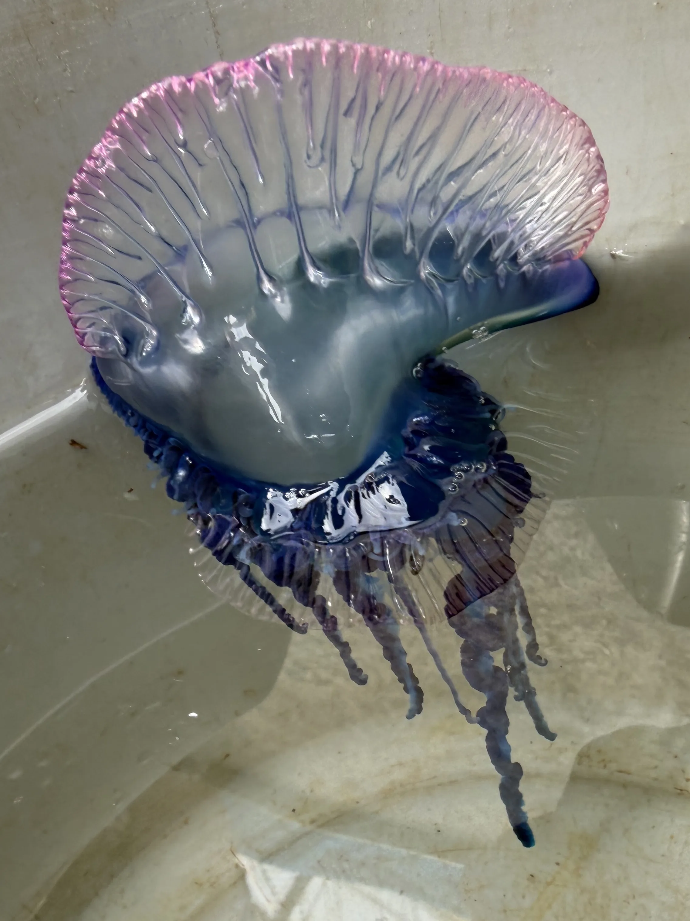 Physalia Physalis, also known as the Portuguese Man o’ War is often mistaken for a jellyfish with its gas-filled float and long stinging tentacles. Aptly named after an 18th century armed sailing vessel with her full complement of sails set, these siphonophores “travel” the ocean’s surface at the mercy of winds and currents. Colonial organisms working together to capture small fish, crustaceans, and plankton, they are mostly composed of water and are highly susceptible to drying out! To prevent this they must roll, flex, twist, and partially submerge their bodies to maintain moisture and survive. Quite like us exploring these vast waters, taking care of our shipmates and looking after the details is making for a successful trip so far.