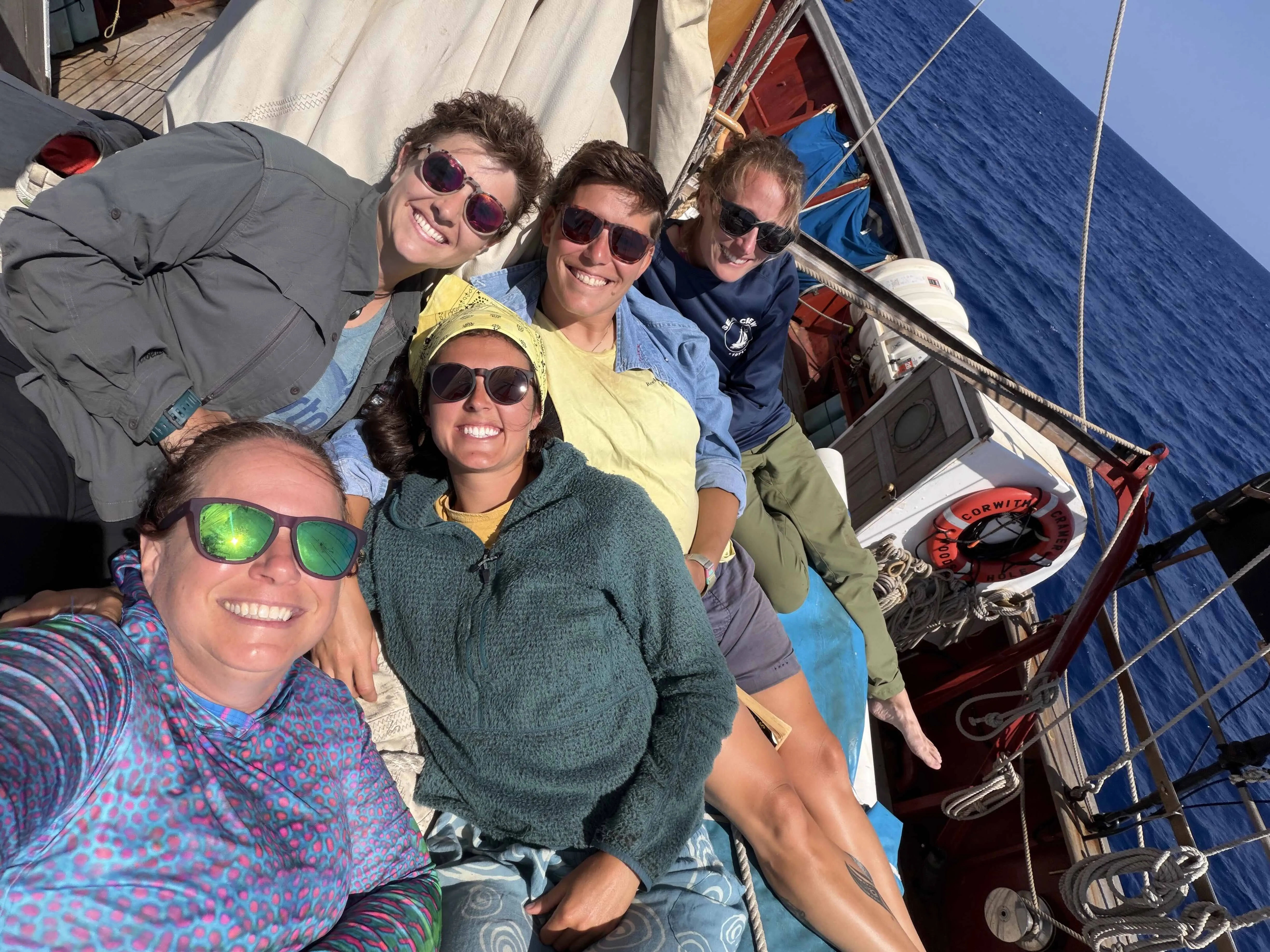 Chief Engineer Clare, Chief Sci Sarah, 2nd Mate Shel, Molecular TA Supi, and Chief Mate Sara enjoying some sun relaxing on the house top