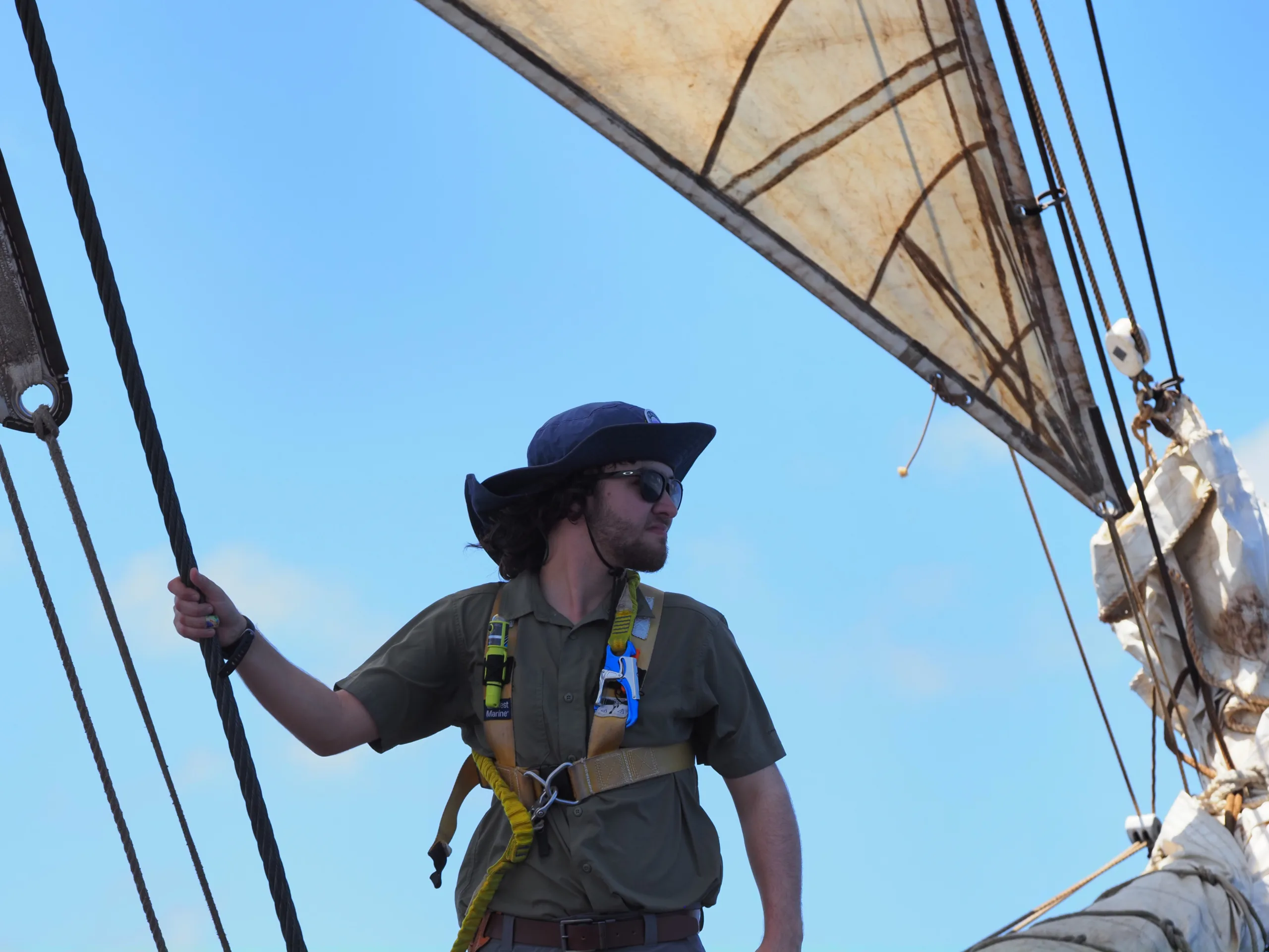 By the end of this week of sailing, we will be nearing Bermuda. I am looking forward to standing watch again, especially lookout. Standing up at the bow of the Cramer gives you a nearly 360° view of the horizon, broken only by our two masts. While looking out for weather coming our way and any potential ship traffic, I often look for signs of wildlife as well. Flying fish have been seen off our bow almost every day since we started our journey, yet I still love watching them. When a school of them jumps from below the surface I find myself wondering about how evolution could have possibly led them down the path of adaptations that resulted in gliding above the swell. Aside from the fish below, I have been keeping a close eye on the occasional bird above, with highlights so far being sandwich terns, magnificent frigatebirds, brown boobys, masked boobys, band-rumped storm petrels, white-tailed tropicbirds, and some shearwaters farther out that I think are Cory’s shearwater. At night, the stars are numerous, and lookout by starlight is a far more meditative role than its daylight counterpart. As we continue to move northward, temperature slowly drops, which I appreciate. I am excited for the day I can change shorts and a short sleeve for a nice sweater and some pants.